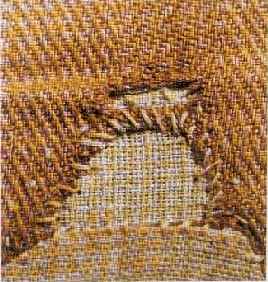 Mais une autre hypothèse, plus vraisemblable, reste possible : une réparation dite invisible, consistant en fils de remplacement (lin + coton) mélangés avec les fils originaux de façon à reconstruire la zone manquante. Une teinture est alors appliquée pour que la réparation se fonde dans l’original. Cette technique était parfaitement maîtrisée par les tisserands du 16 ème siècle, selon M. Robert BUDEN, président d’une société de restauration de tapisseries anciennes et correspond aux indices découverts par Raymond ROGERS.